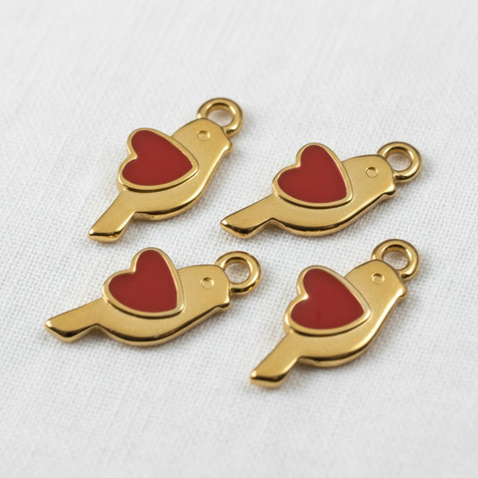 Gold Bird Heart Charms: 24K Gold Red Enamel Martaki Pendant 4-Pack