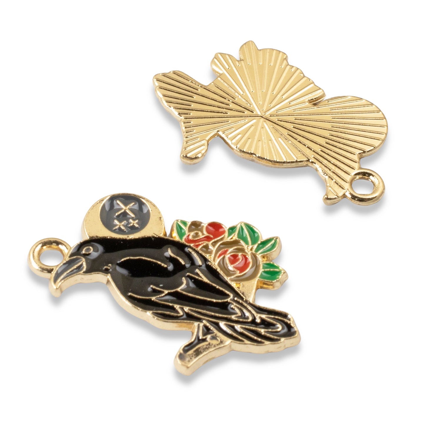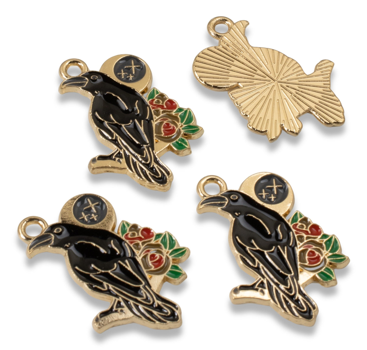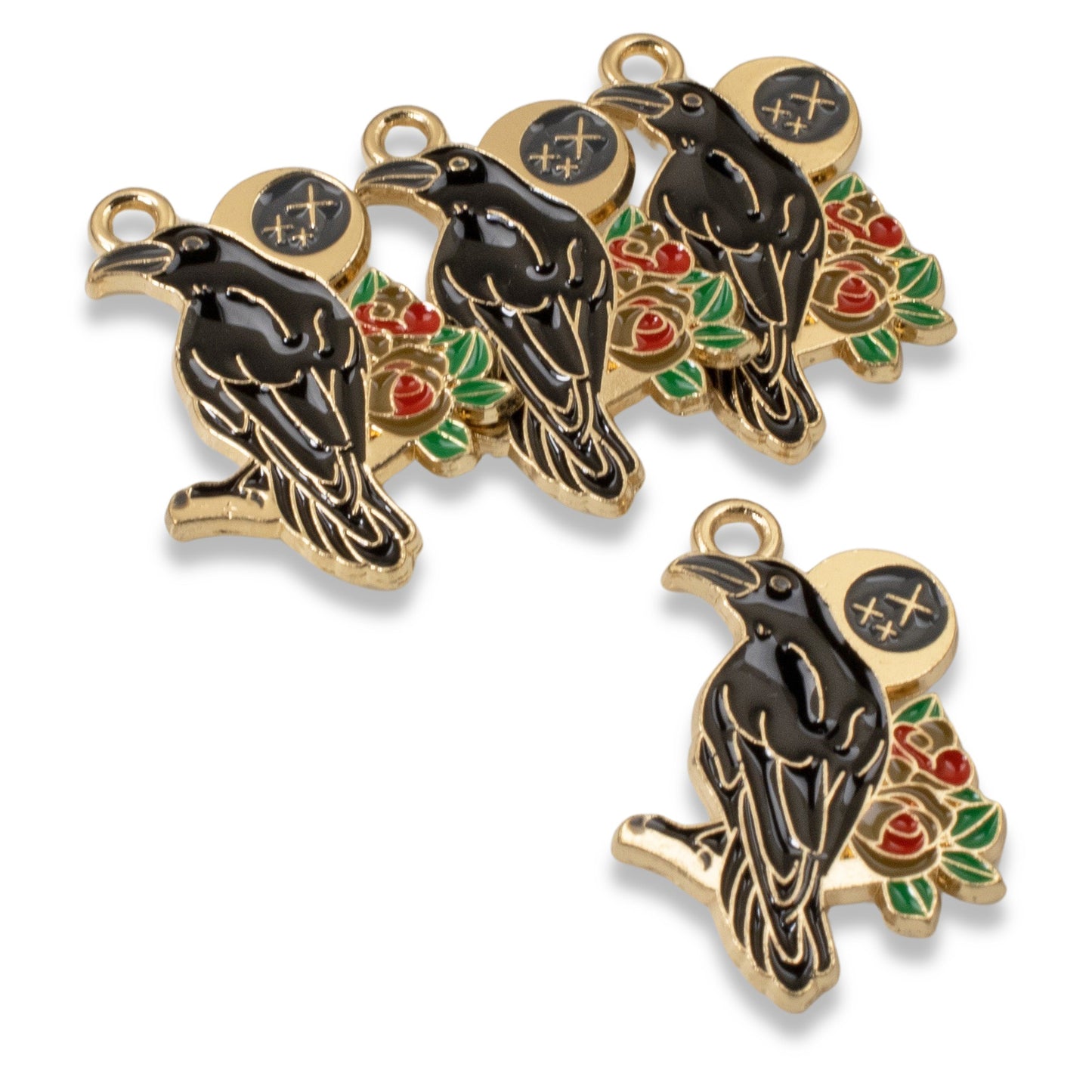 Each charm features a striking raven design, enhanced by intricate moon and rose motifs, all highlighted with a golden outline.