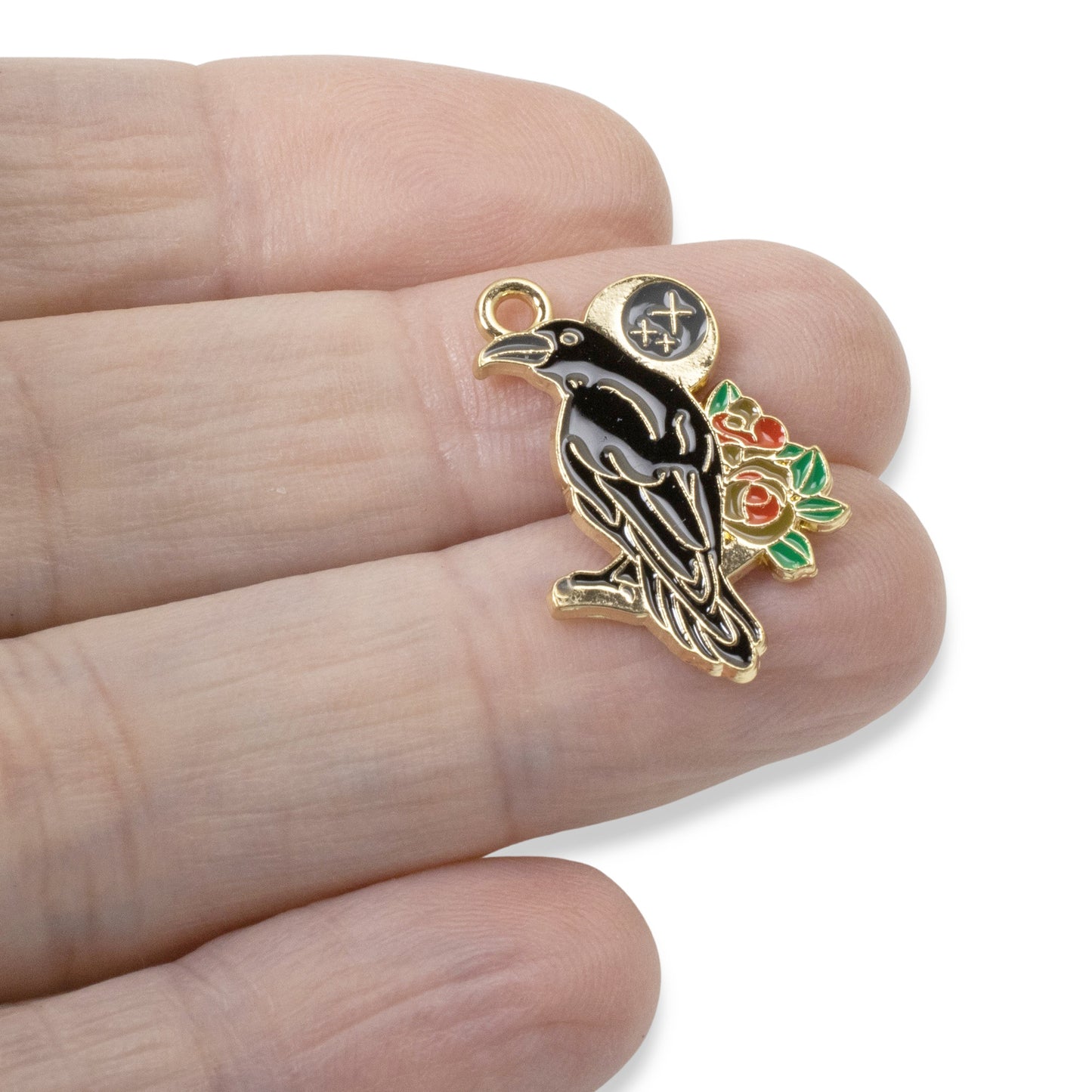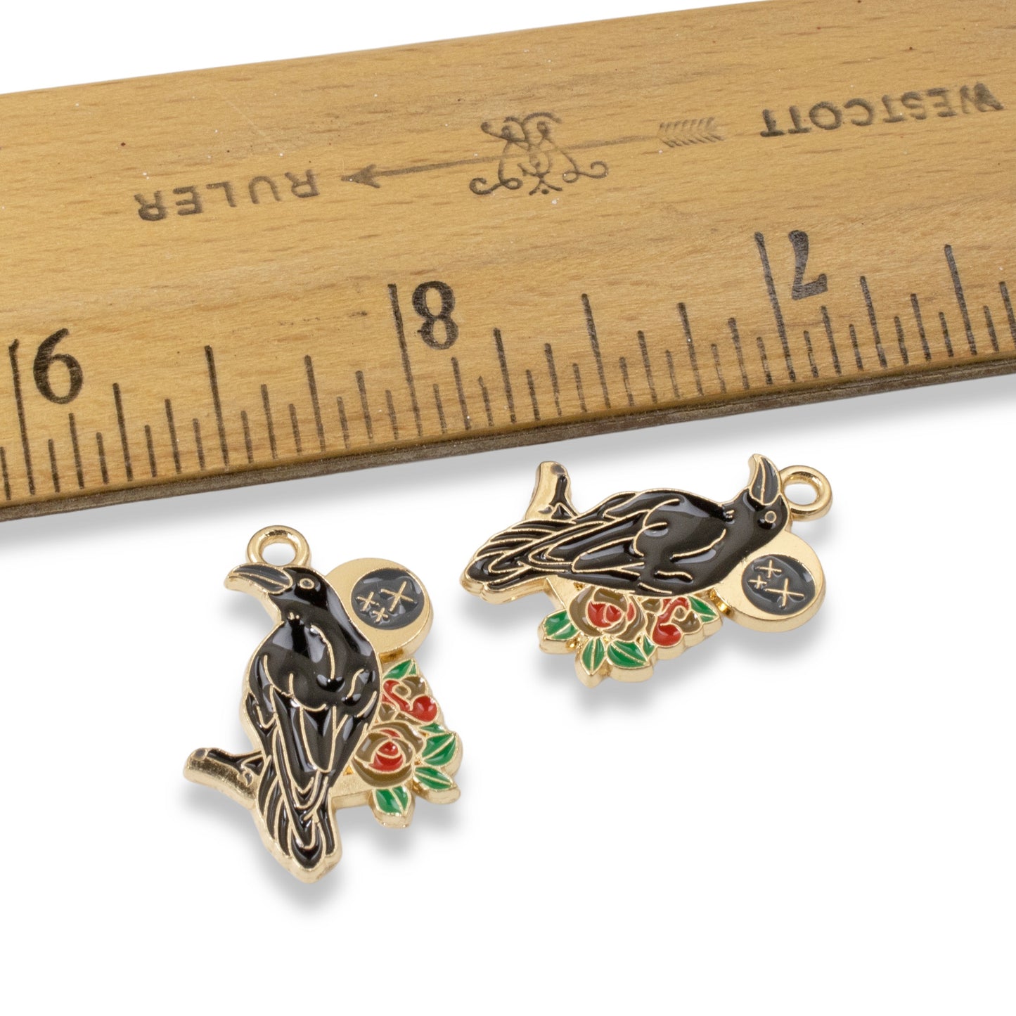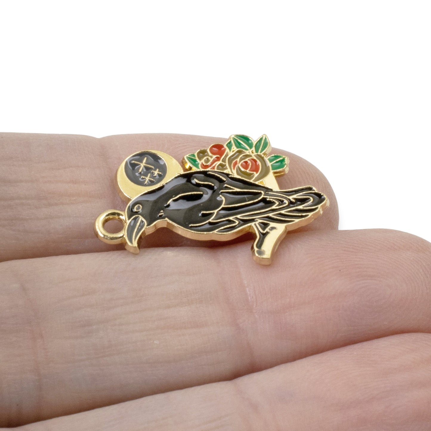 Each charm features a striking raven design, enhanced by intricate moon and rose motifs, all highlighted with a golden outline.