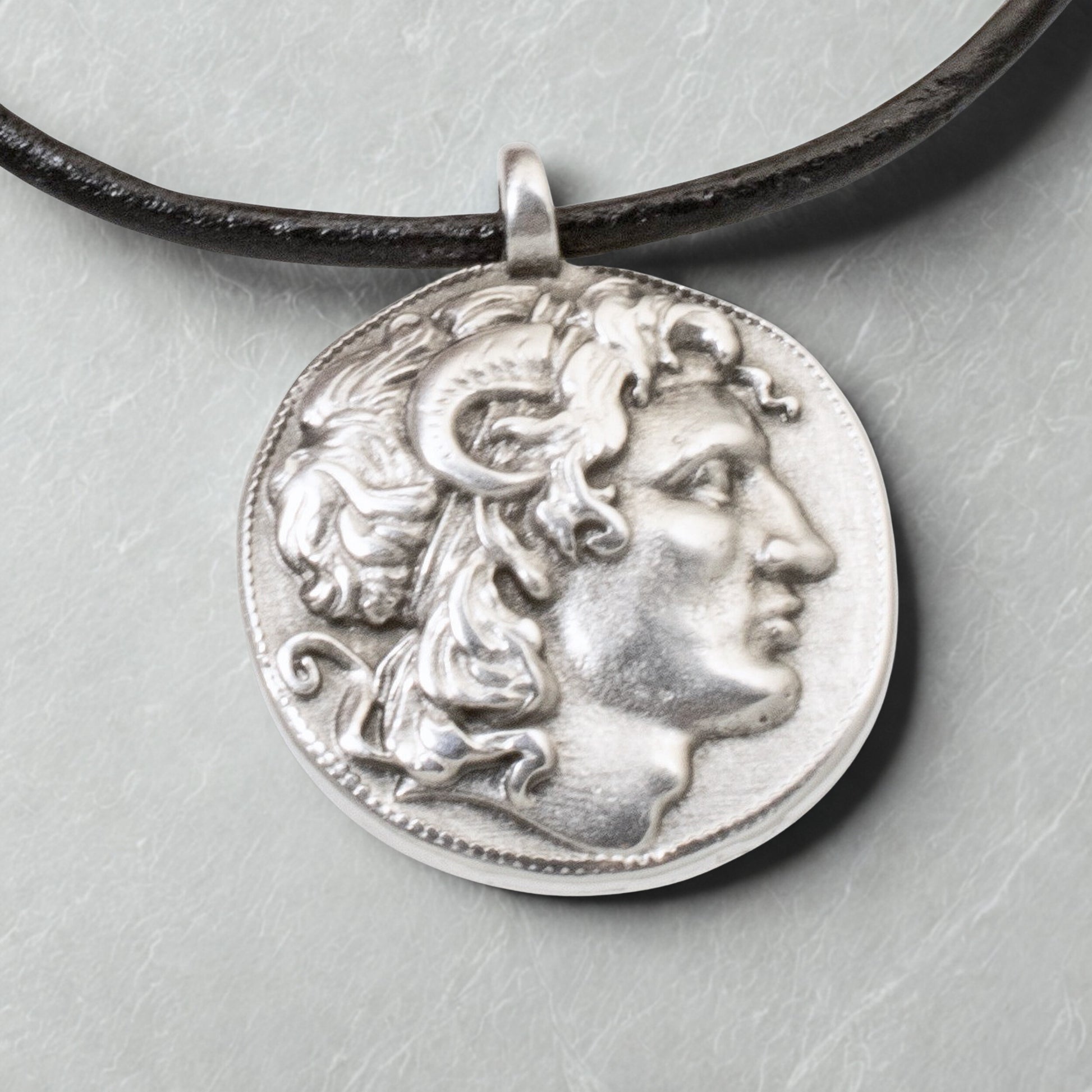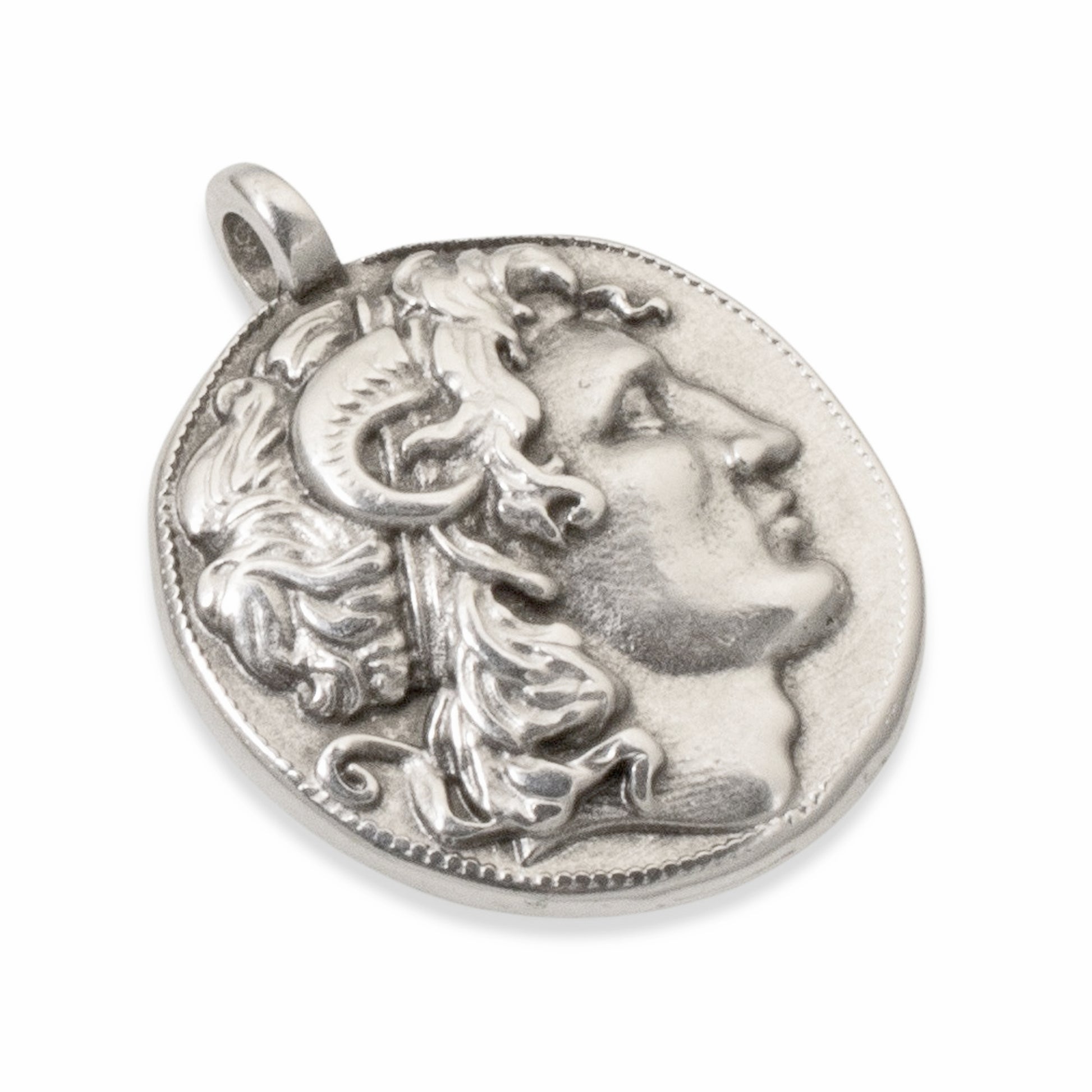 Alexander the Great Pendant, Sterling Silver Plated European Charm, Double-Sided Classical Ancient Greek Coin 1Pc