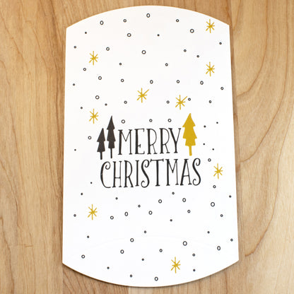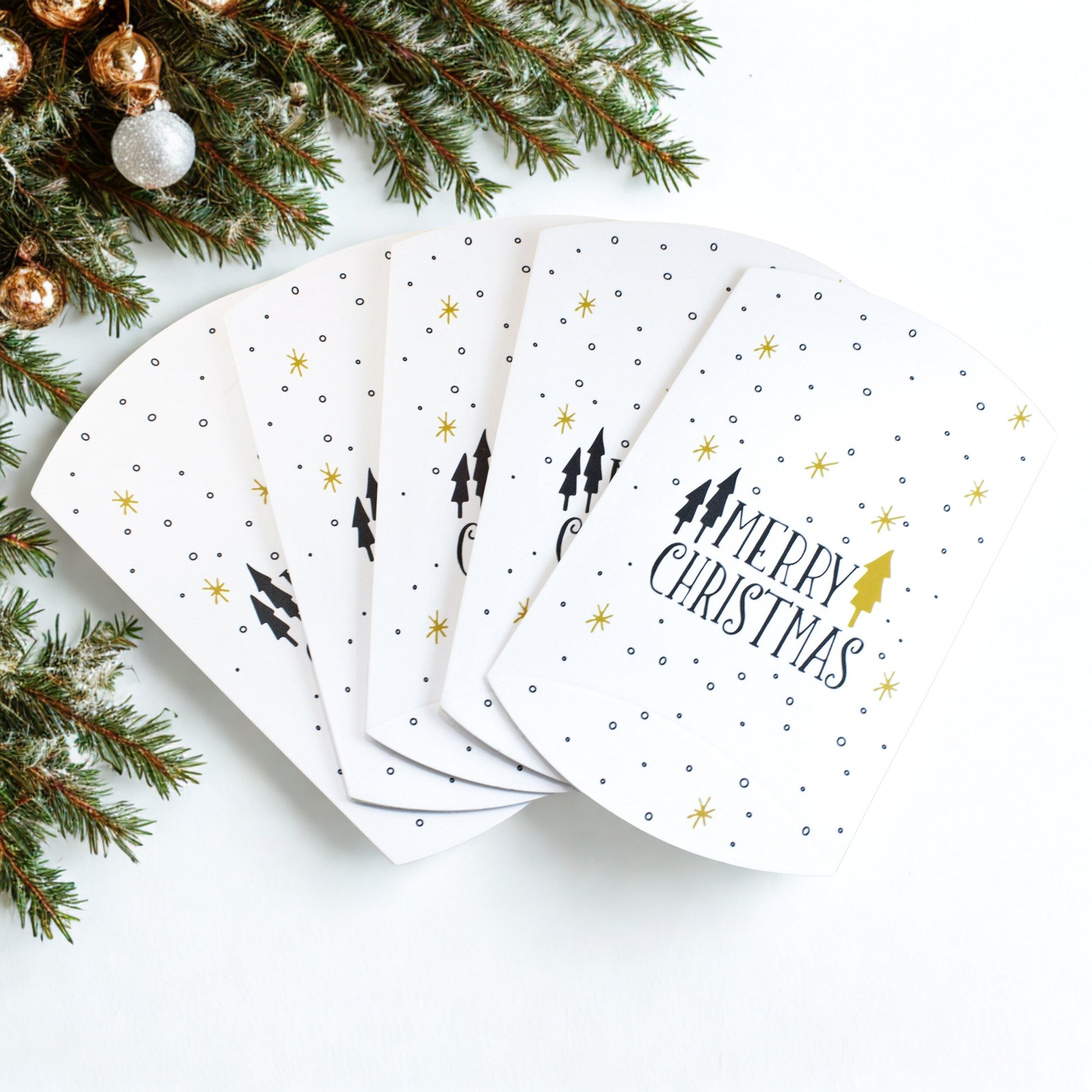 Each box features an elegant "Merry Christmas" message surrounded by delicate gold stars and stylized Christmas trees on crisp white paper. The timeless black and gold color scheme creates a premium, sophisticated look that elevates any gift presentation.