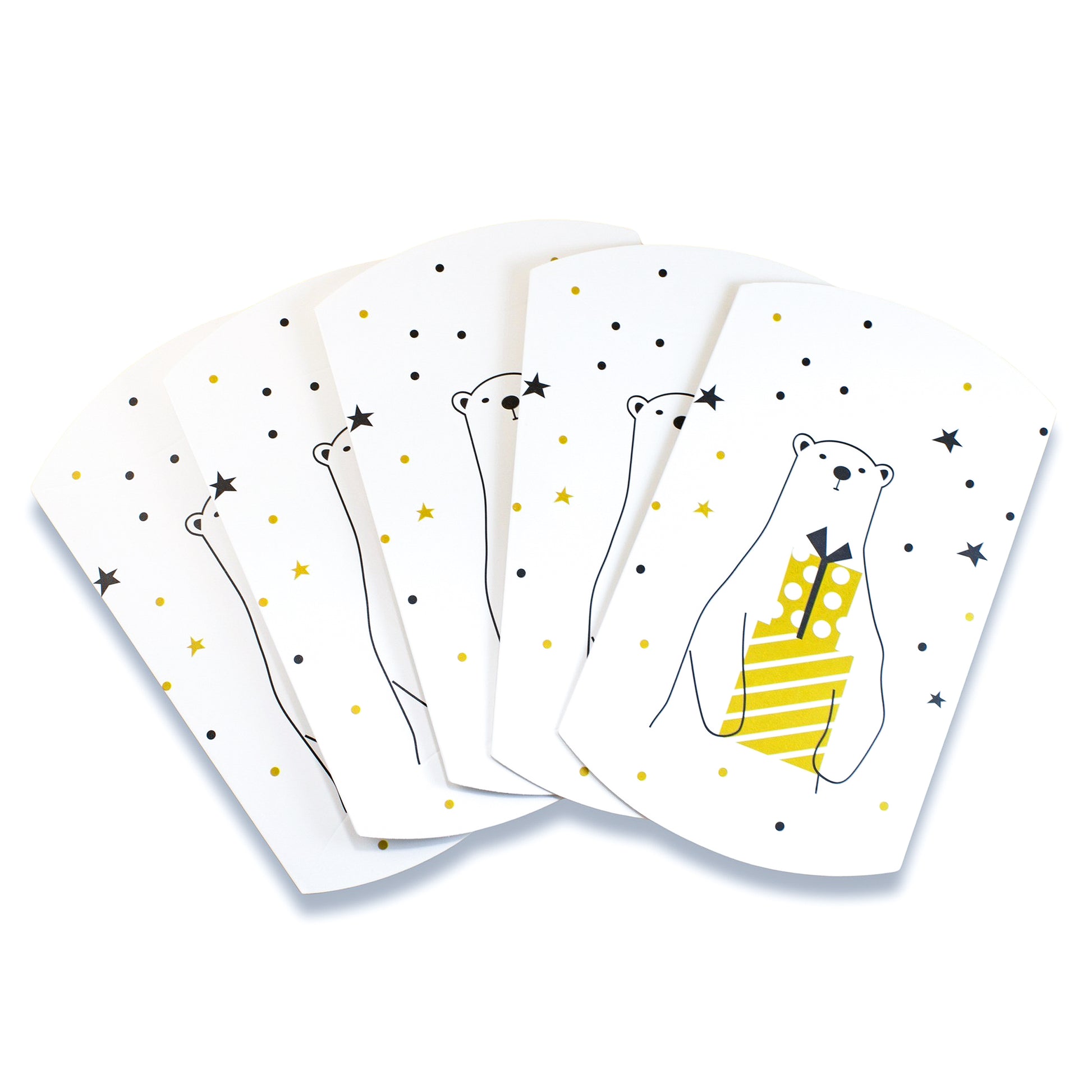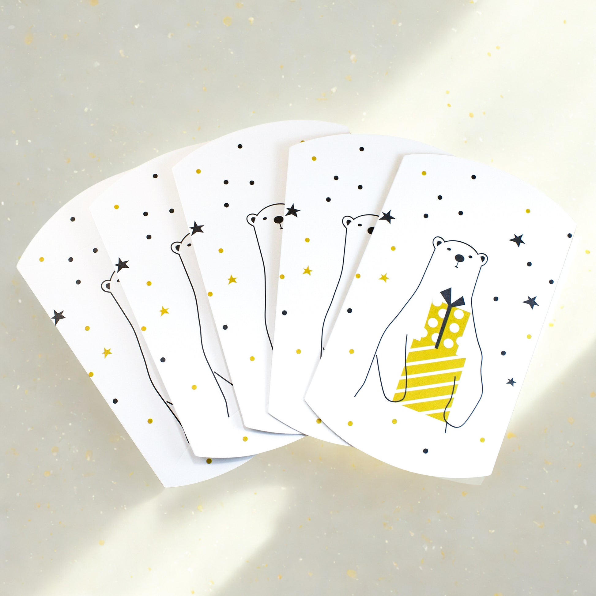 Each box features an irresistibly cute polar bear holding a striped gift, surrounded by cheerful stars and festive details in charming black and gold. The whimsical illustration brings joy and wonder to every present, perfect for spreading holiday magic.