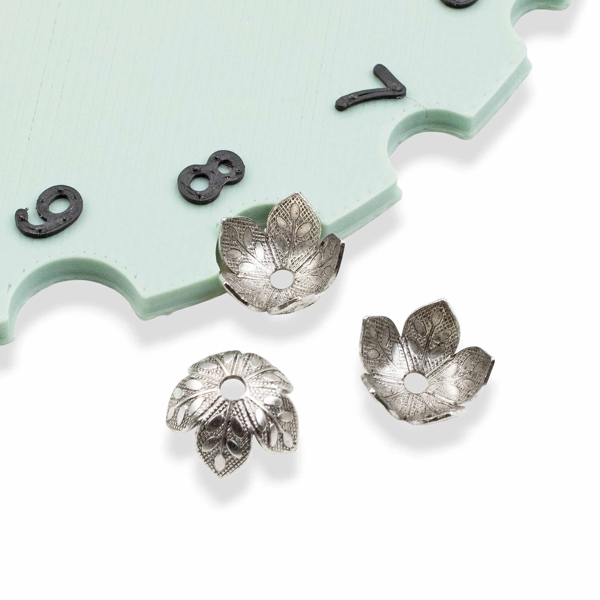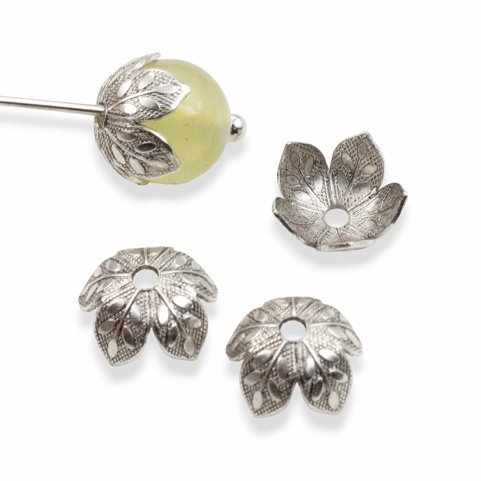 Unlike simple stamped designs, these etched caps feature dimensional leaf veining and layered petal patterns. The antique silver finish settles into every carved detail, creating depth that catches the eye from every angle. Perfect for pairing with cool-toned gemstones like moonstone, aquamarine, or labradorite.