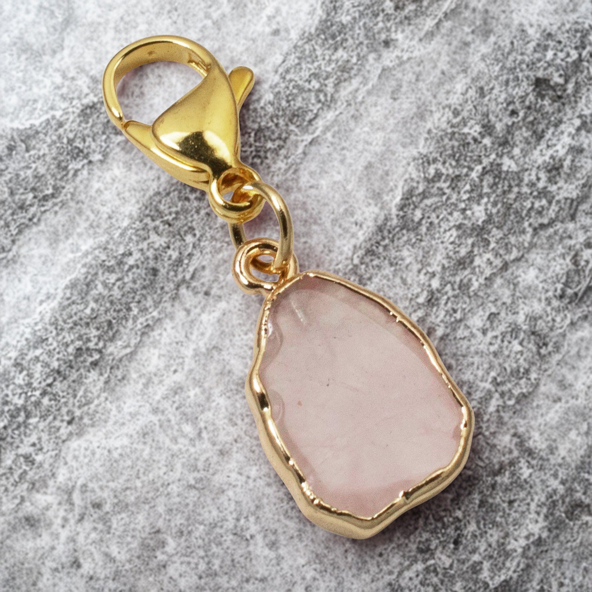 Rose Quartz Clip On Charm, Gold Edged Pink Crystal for Bag, Jewelry Accessory