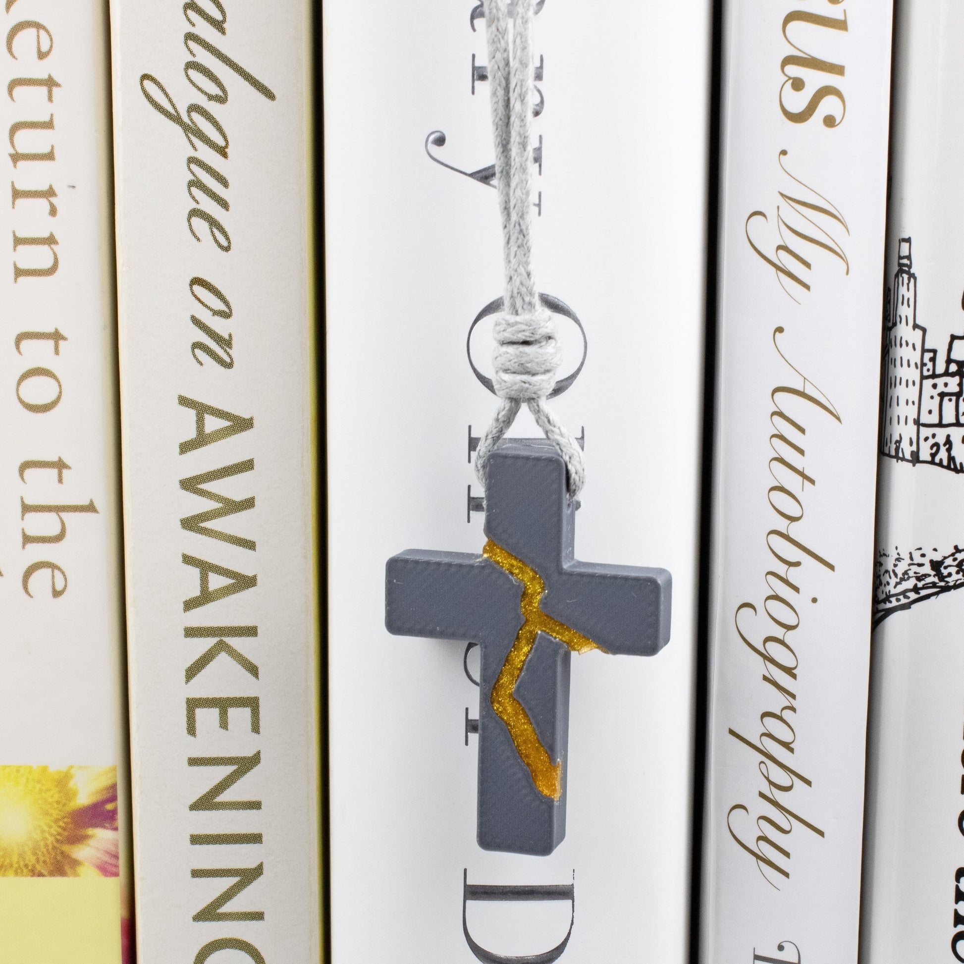 Gray Kintsugi Cross Necklace, Inspirational Wearable Art, Handmade Pendant, Meaningful Gift, Japanese Philosophy Jewelry