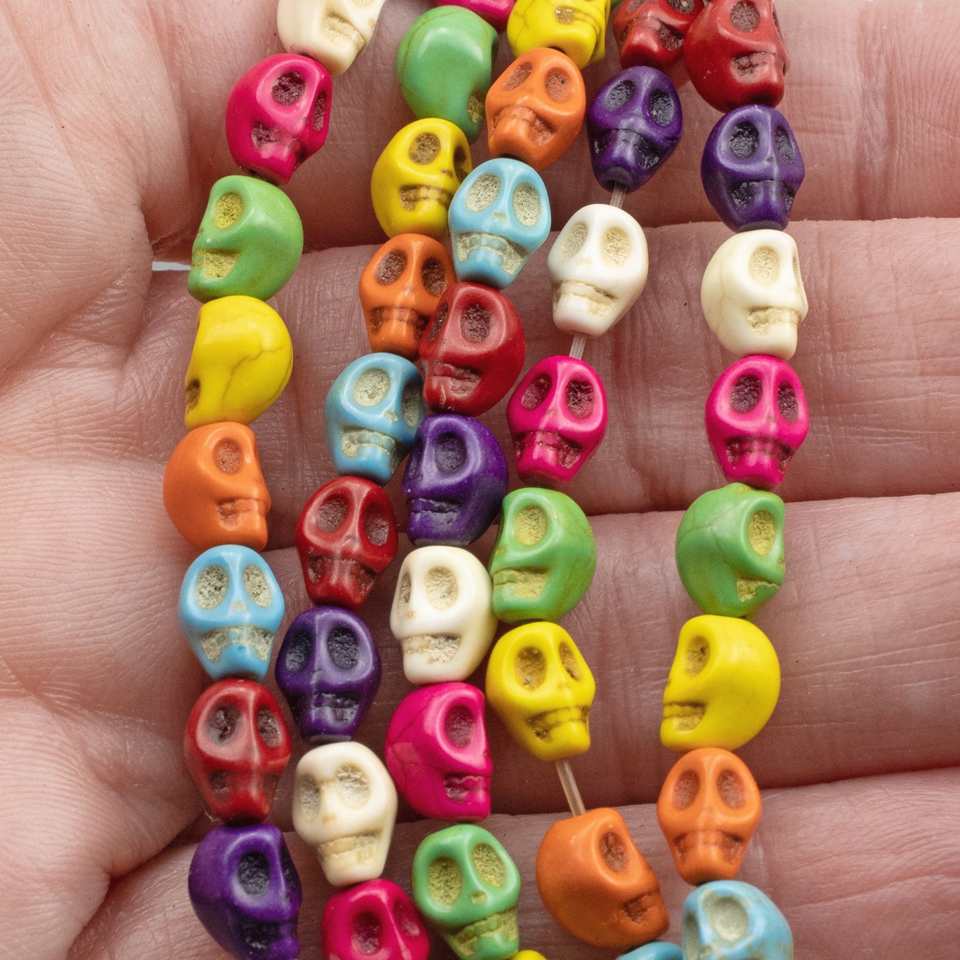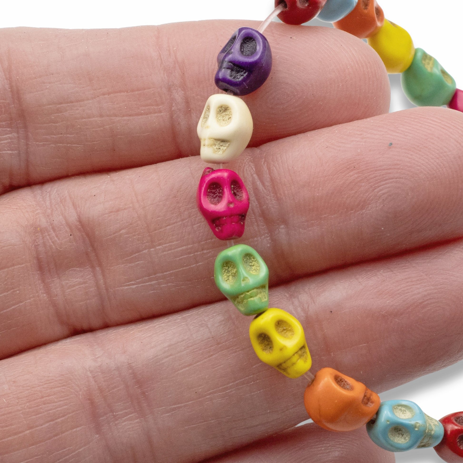 Create spooky-chic jewelry and festive fall accessories with these vibrant Colorful Skull Beads! This 15-inch strand of mini magnesite stones brings a playful Halloween spirit and Day of the Dead celebration to your seasonal crafting projects.