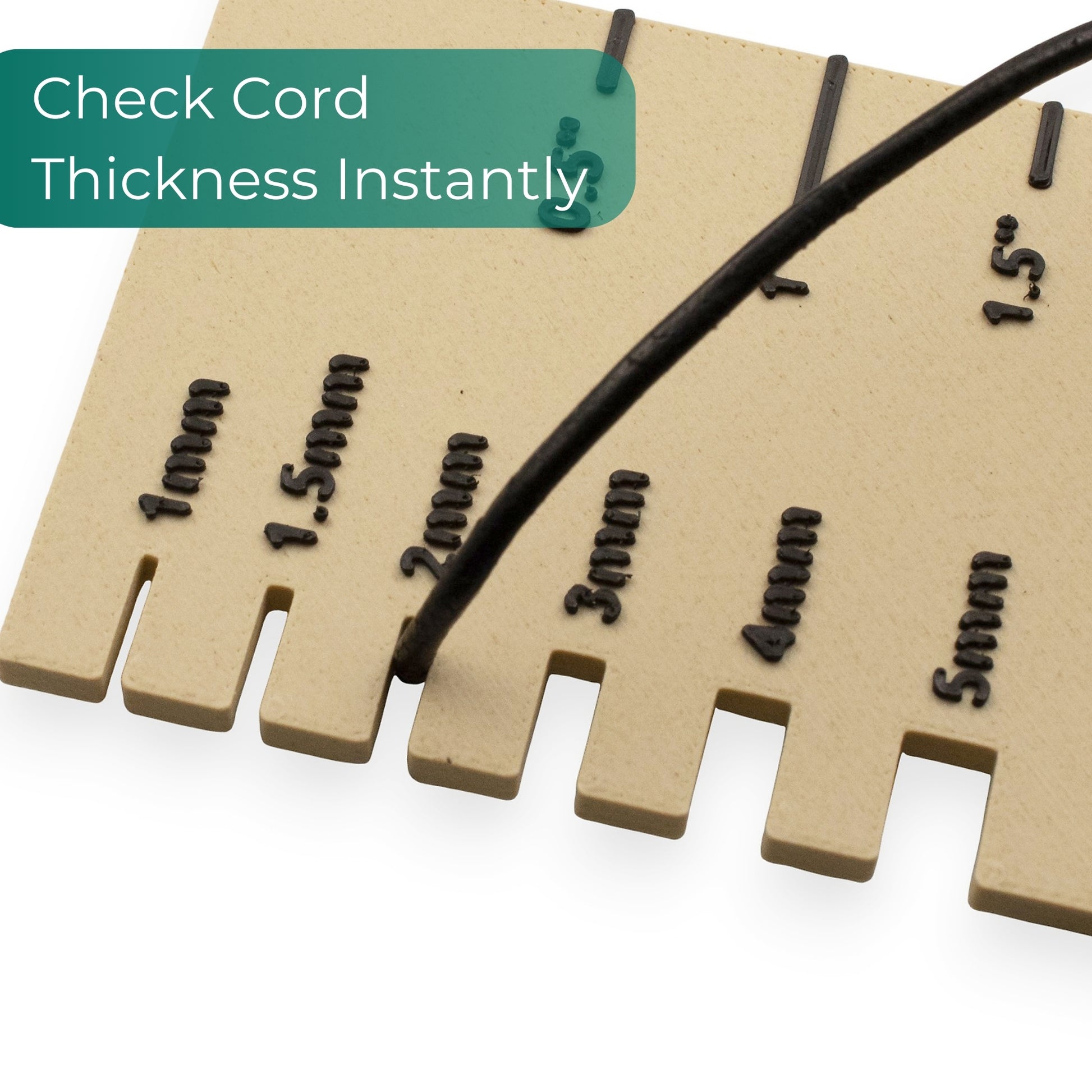- Cord Thickness Gauge (1-5mm slots) - Test leather cord, ribbon, and soft materials for a perfect fit