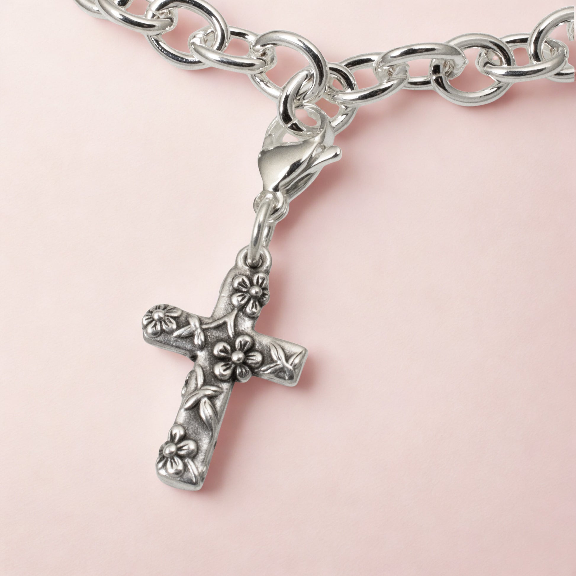 Carry your faith wherever you go with this exquisite silver Floral Cross clip-on charm! Beautifully crafted with intricate flowers that bring nature's beauty to this meaningful symbol.