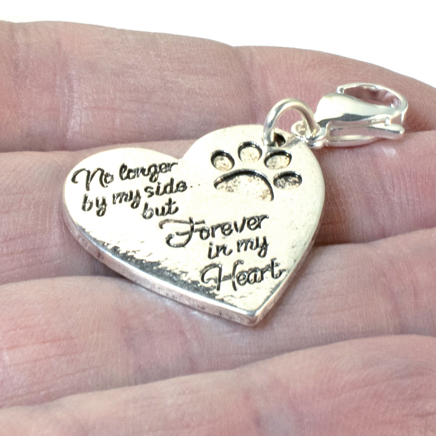 Silver No Longer By My Side Paw Print Heart Clip-on Charm, Pet Memorial Pendant